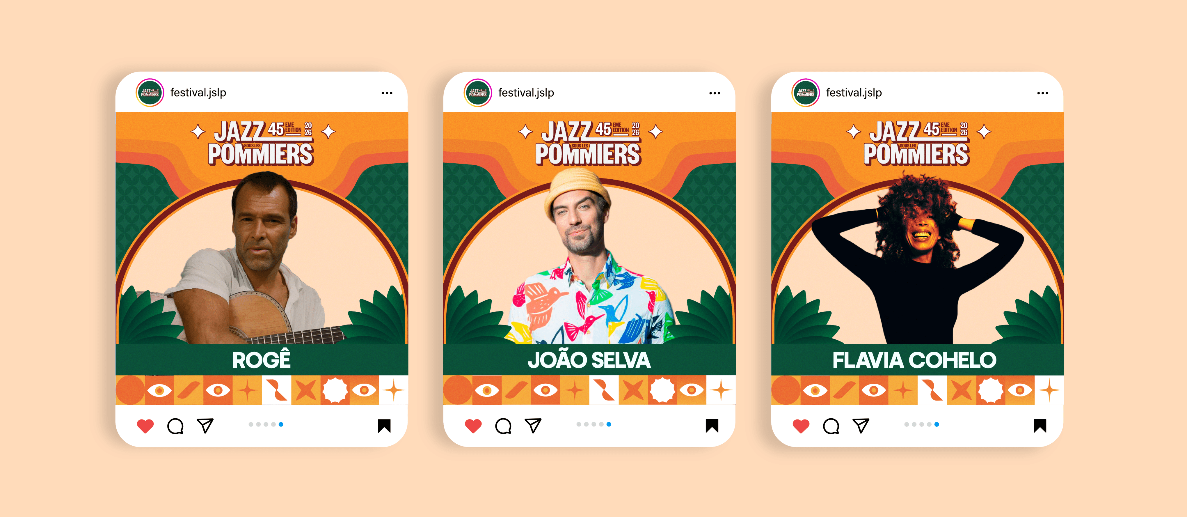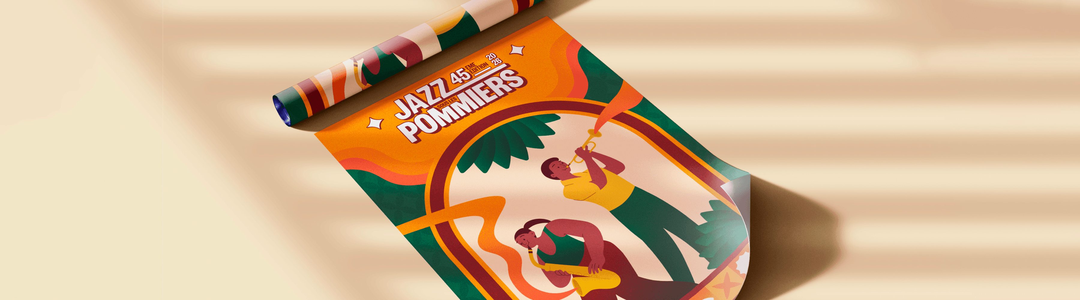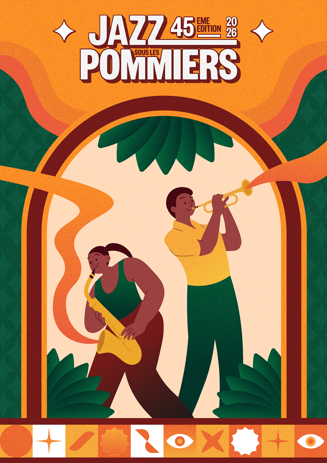 Jazz sous les Pommiers 2026 est l'identité visuelle de la 45ème édition du festival de Coutances. Son univers solaire et organique associe vert forêt, orange ambré et illustrations flat design aux arches végétales.