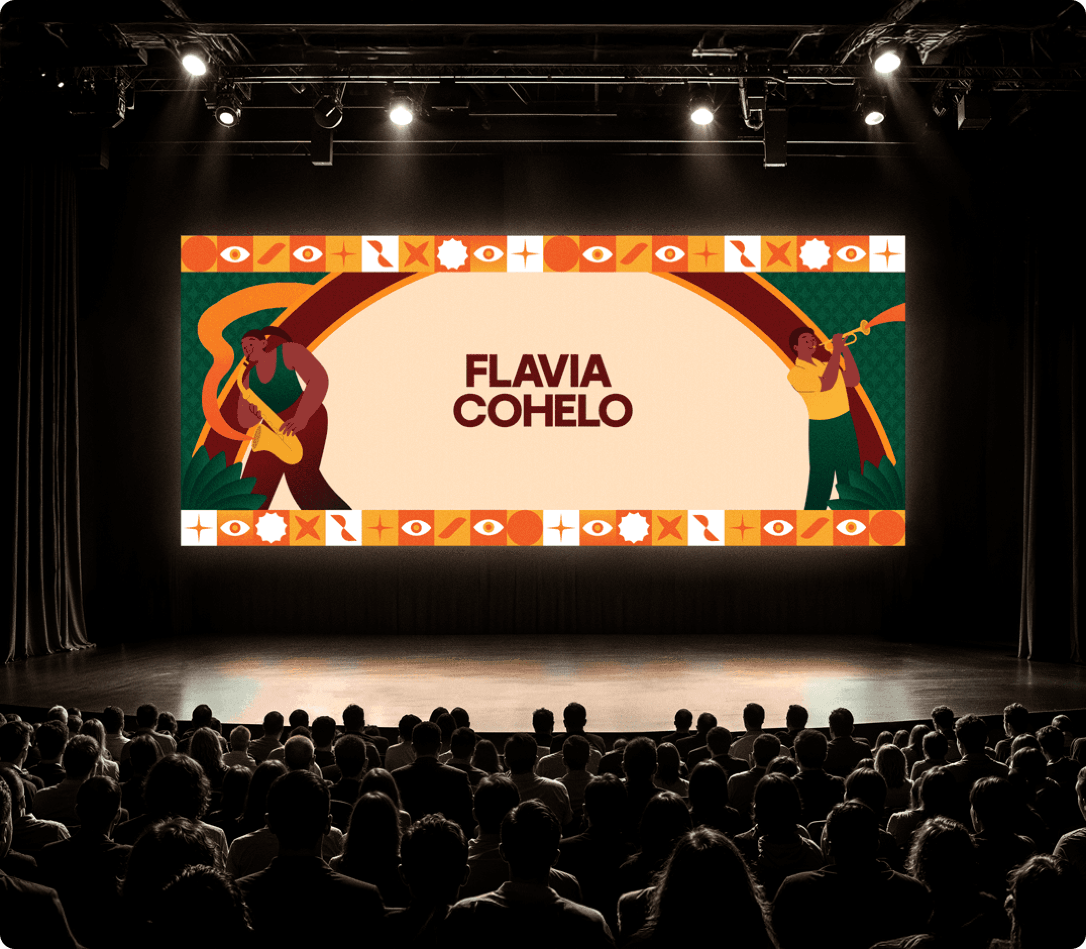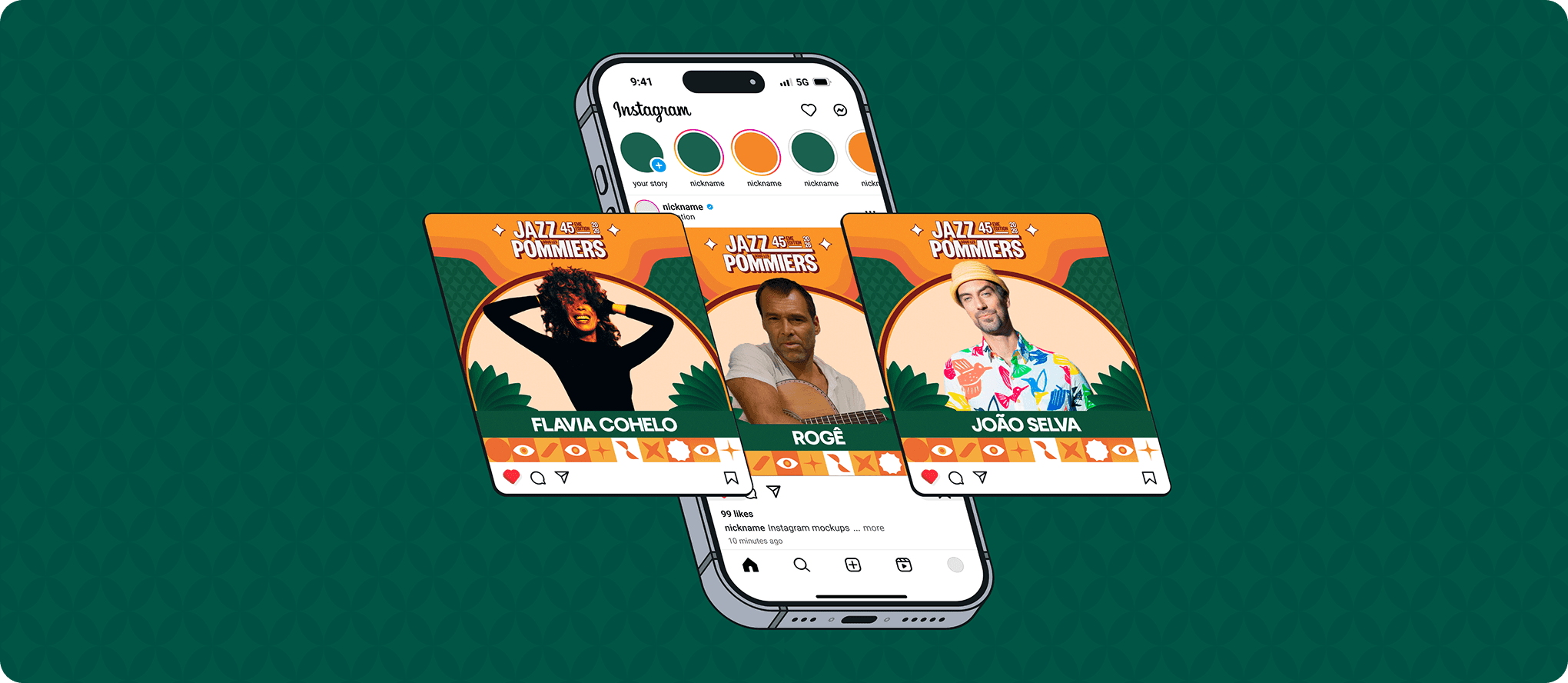 Jazz sous les Pommiers 2026 est l'identité visuelle de la 45ème édition du festival de Coutances. Son univers solaire et organique associe vert forêt, orange ambré et illustrations flat design aux arches végétales. Du logo anniversaire à la scénographie urbaine, en passant par les réseaux sociaux et le merchandising coloré, chaque support célèbre l'héritage musical avec une esthétique contemporaine et festive.